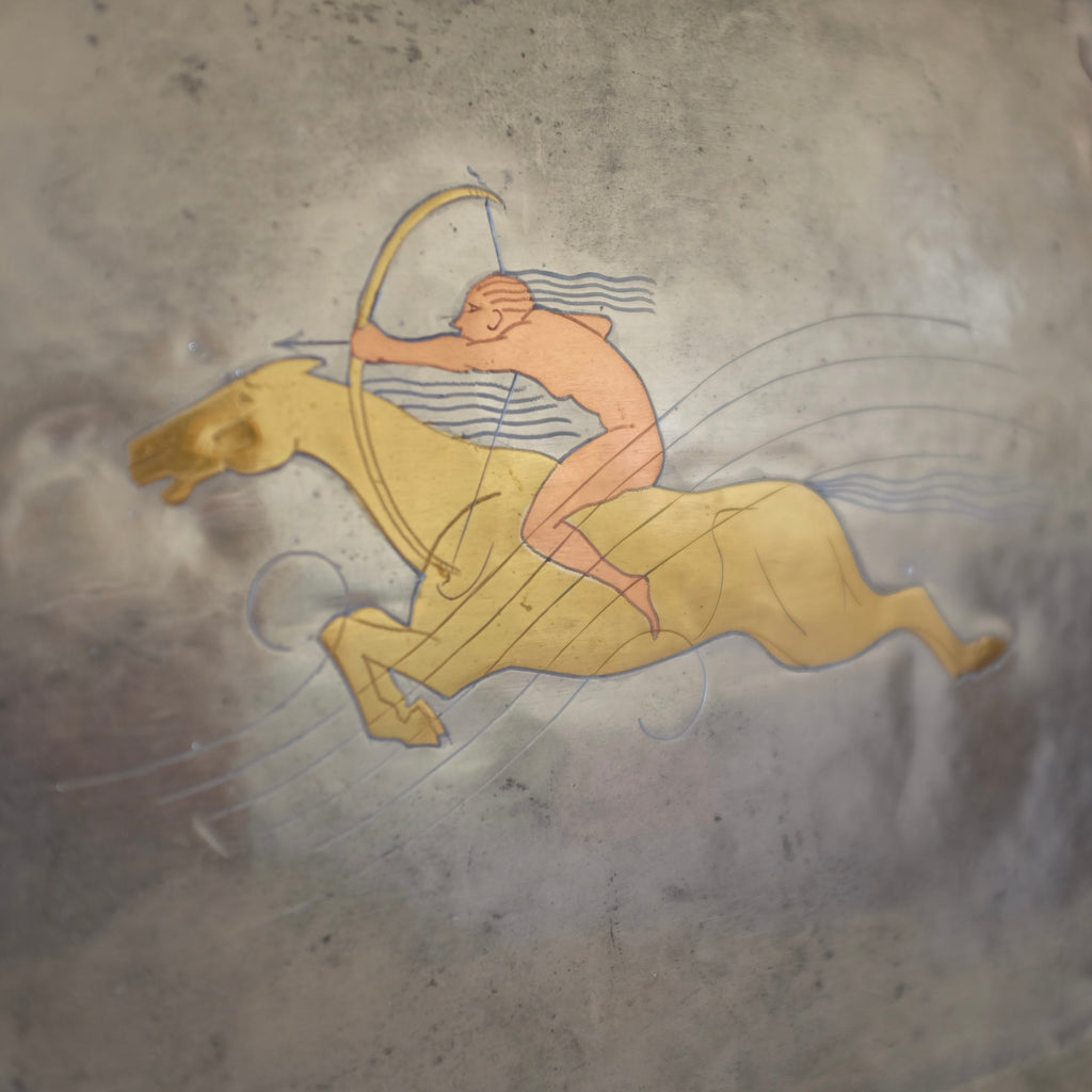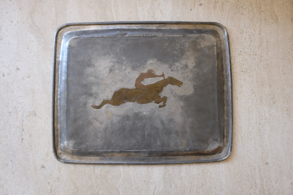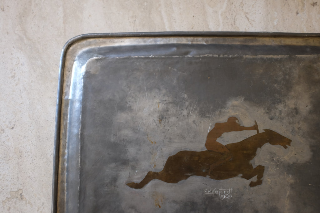 Pewter and Brass tray dated 1930 by Ellen V Kajerdt, Sweden. Rectangular shape with an engraved image at the center depiction a hunting scene with a man on a horse with an arrow. Age appropriate wear to the pewter and brass. Highly decorative and a beautiful example of the use of pewter during the Swedish Grace era. Designers mark underneath.