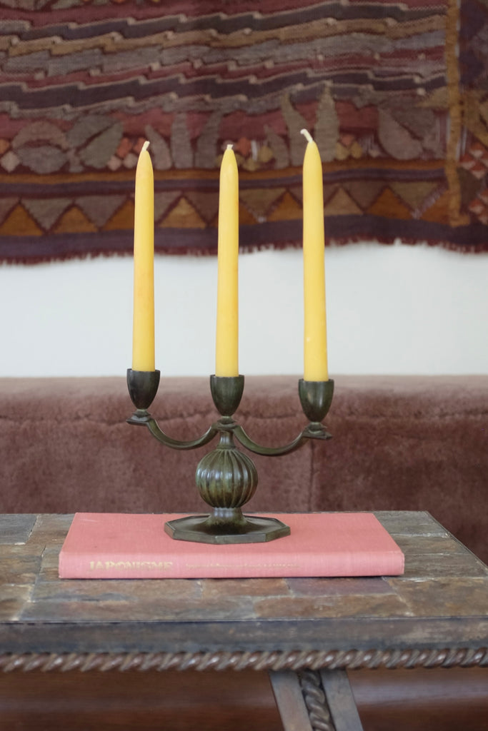 Small bronze candleholder by GAB, Sweden, with space for 3 candles. Beautiful curvy shape with a nice green shade. Age appropriate wear with some shading to the bronze and a small engraving on the foot.