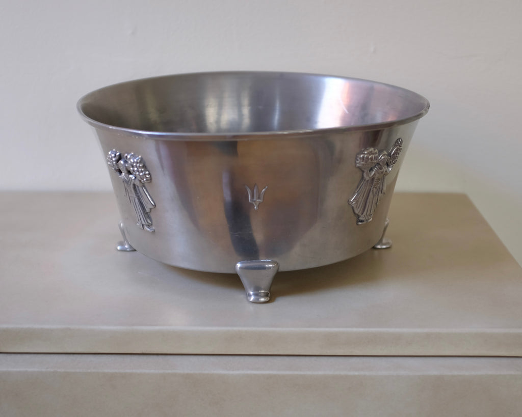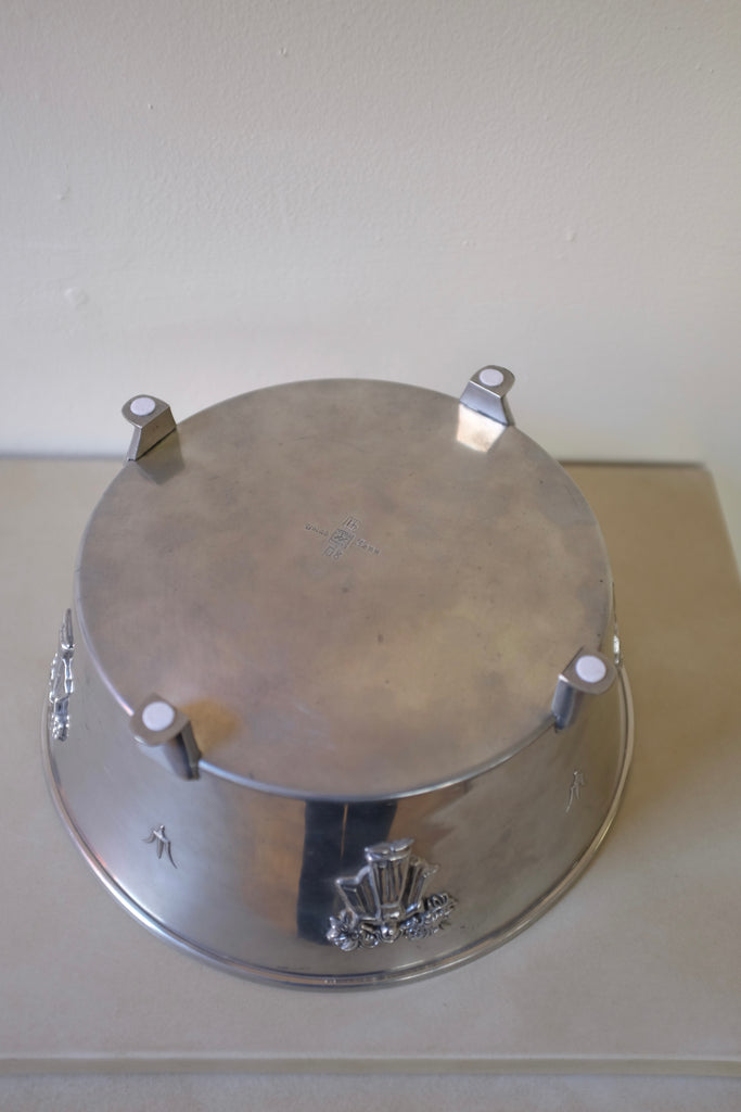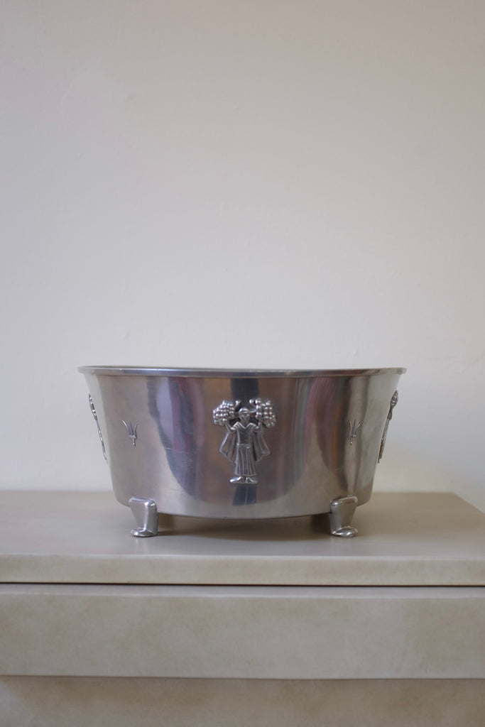 Impressive 1938 Large Pewter Jardinière by Hugo Gehlin for Ystad Tenn. Decorated with figurines around the body and small fets that elevates the Jardinière slightly. The round bowl have lost shape a little bit due to age appropriate wear.