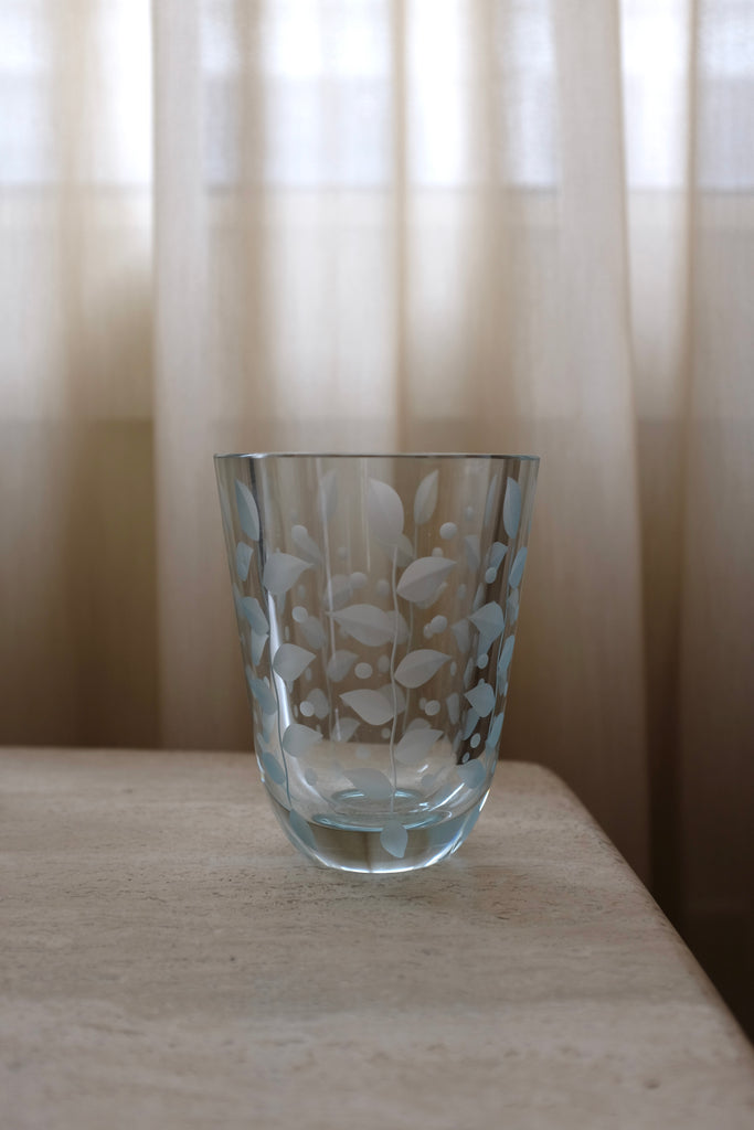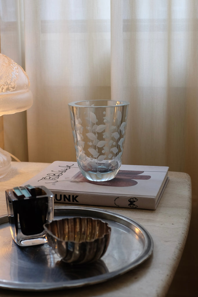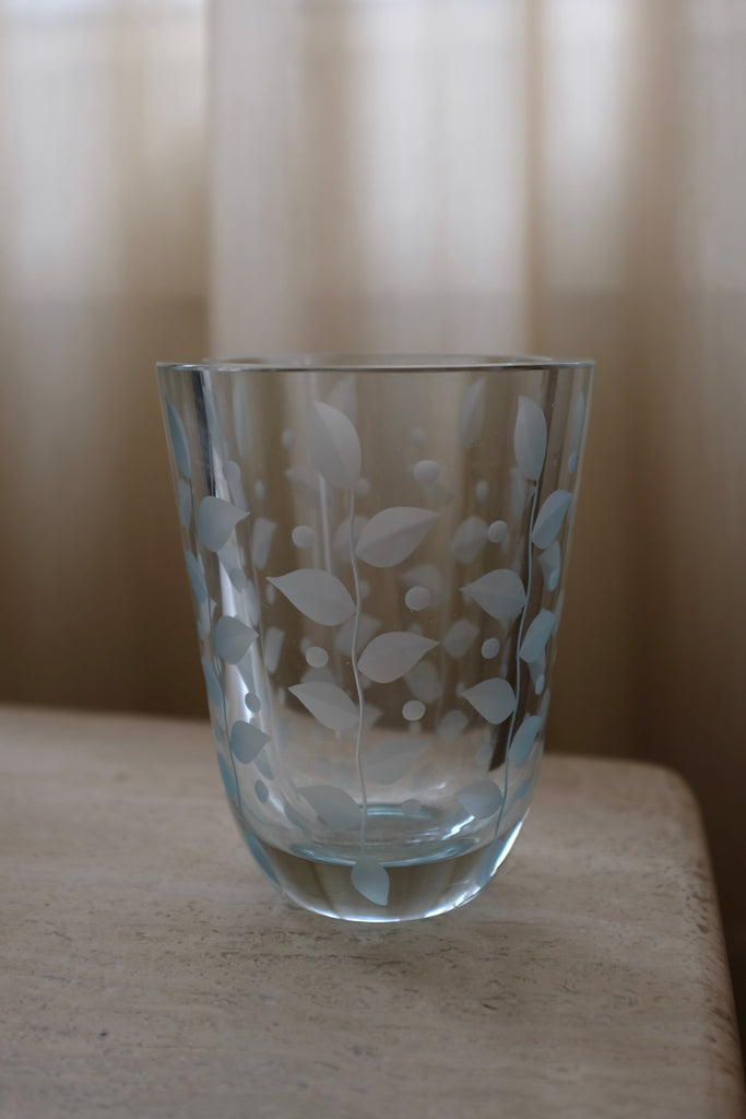 Circa 1950s Glass Vase Glass Vase by Edward Hald for Orrefors. Hald was active at the Swedish Glass maker Orrefors between 1917-1978 and was a prolific Swedish glass designer who featured during the World exhibition in Paris in 1925 where the Swedish pavilion was a success. He is especially known for his engraved designs. Very good vintage condition with Orrefors engraved at the bottom.
