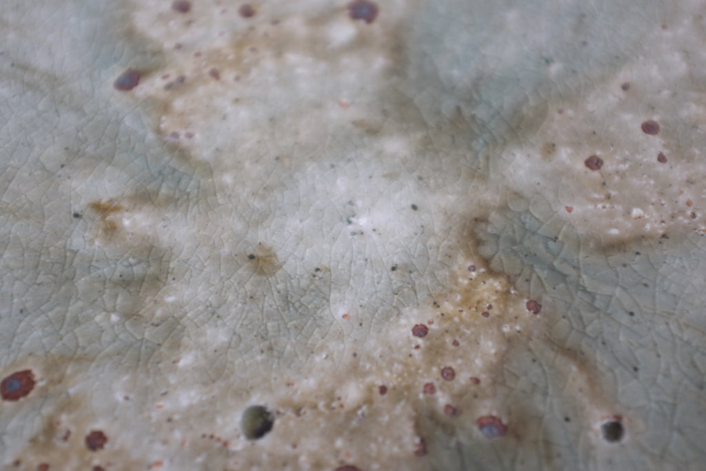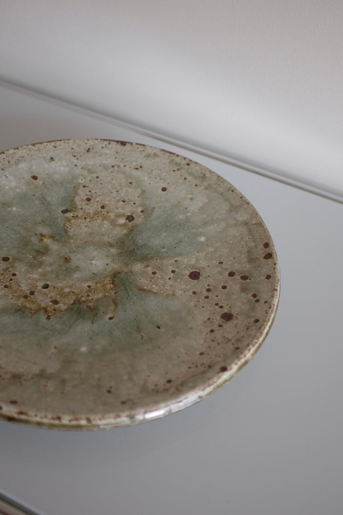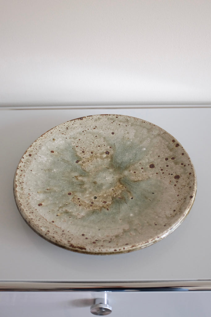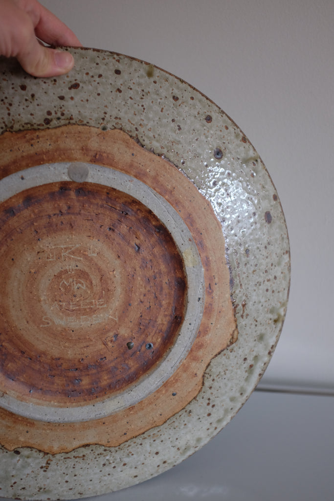 Impressive Large Hand-thrown Decorative Dish by Swedish artist Marianne Westman from the 1960s. Beautiful brutalist feeling with a brown burnt looking ceramic coming though the white and green glazed surface. Made at the Rörstrand Ateljé in Sweden where Marianne Westman produced a unique collection of stoneware objects during the 1950/60s. In a very good condition with few signs of wear and makers signature underneath.