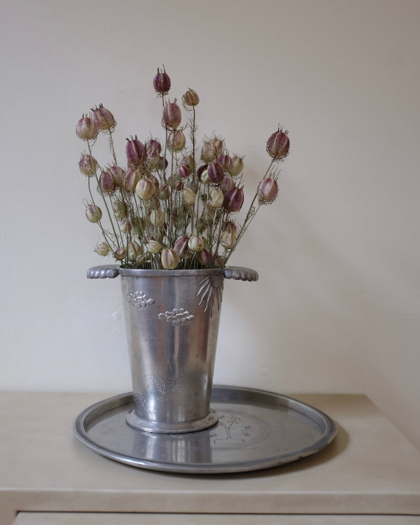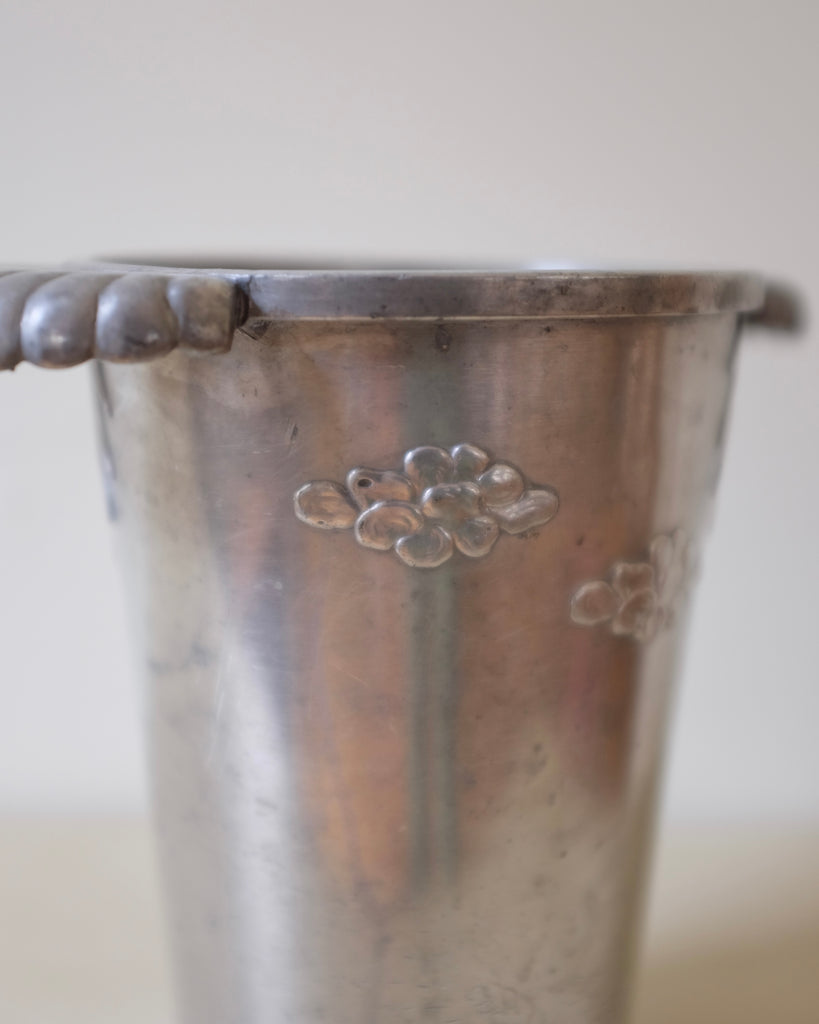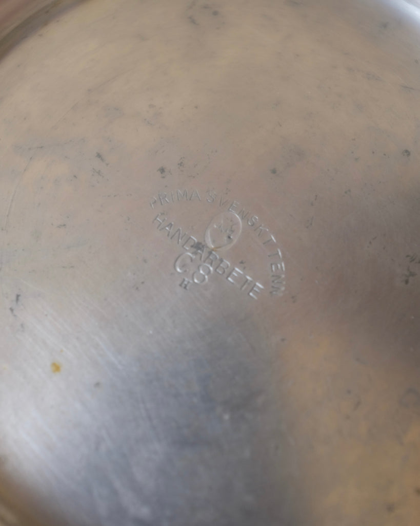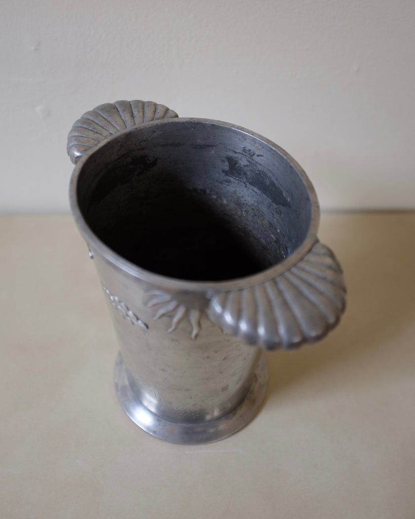 Fantastic Swedish Pewter Vase from 1929 and marked with H (to us unknown maker). Wing looking handles with a pattern across the body featuring the sun, clouds and grass. Age appropriate wear to the pewter and shape.