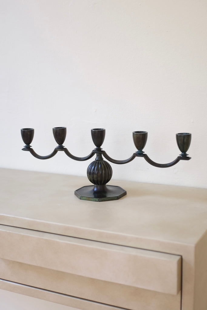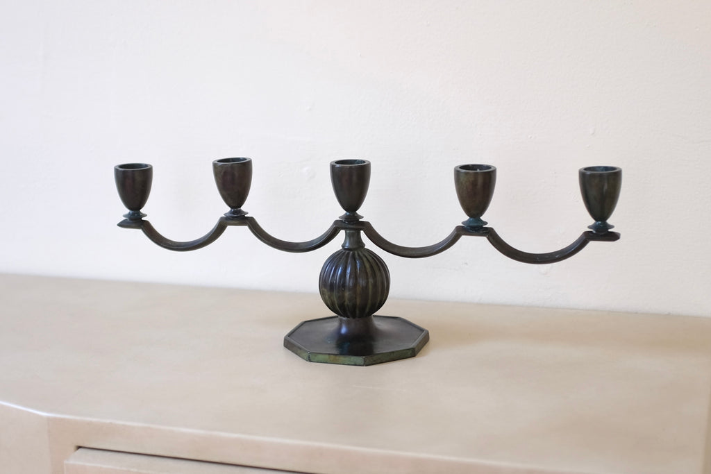 1930s bronze candleholder by GAB, Sweden, with space for 5 candles. Beautiful curvy shape with a nice green shade. Age appropriate wear with some shading to the bronze.