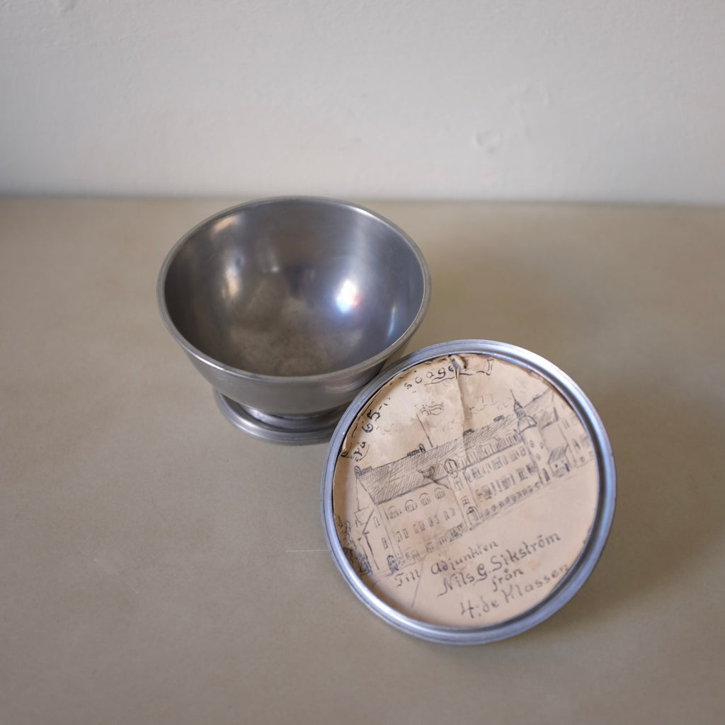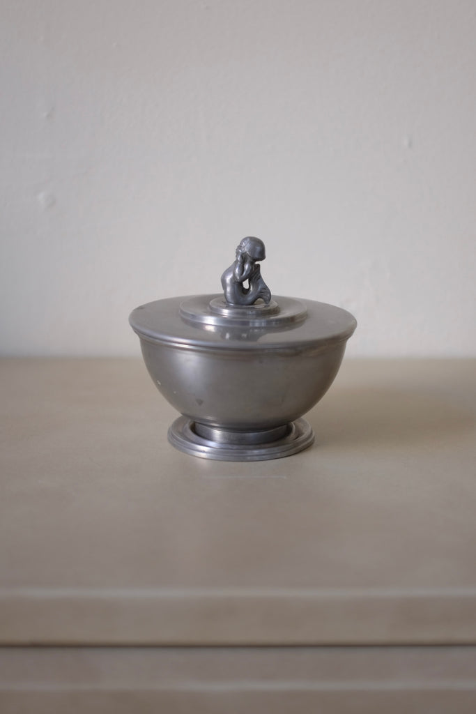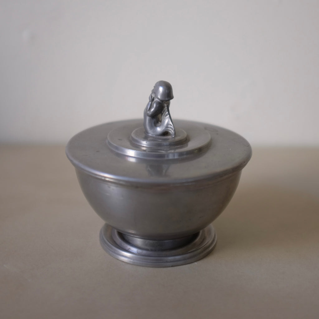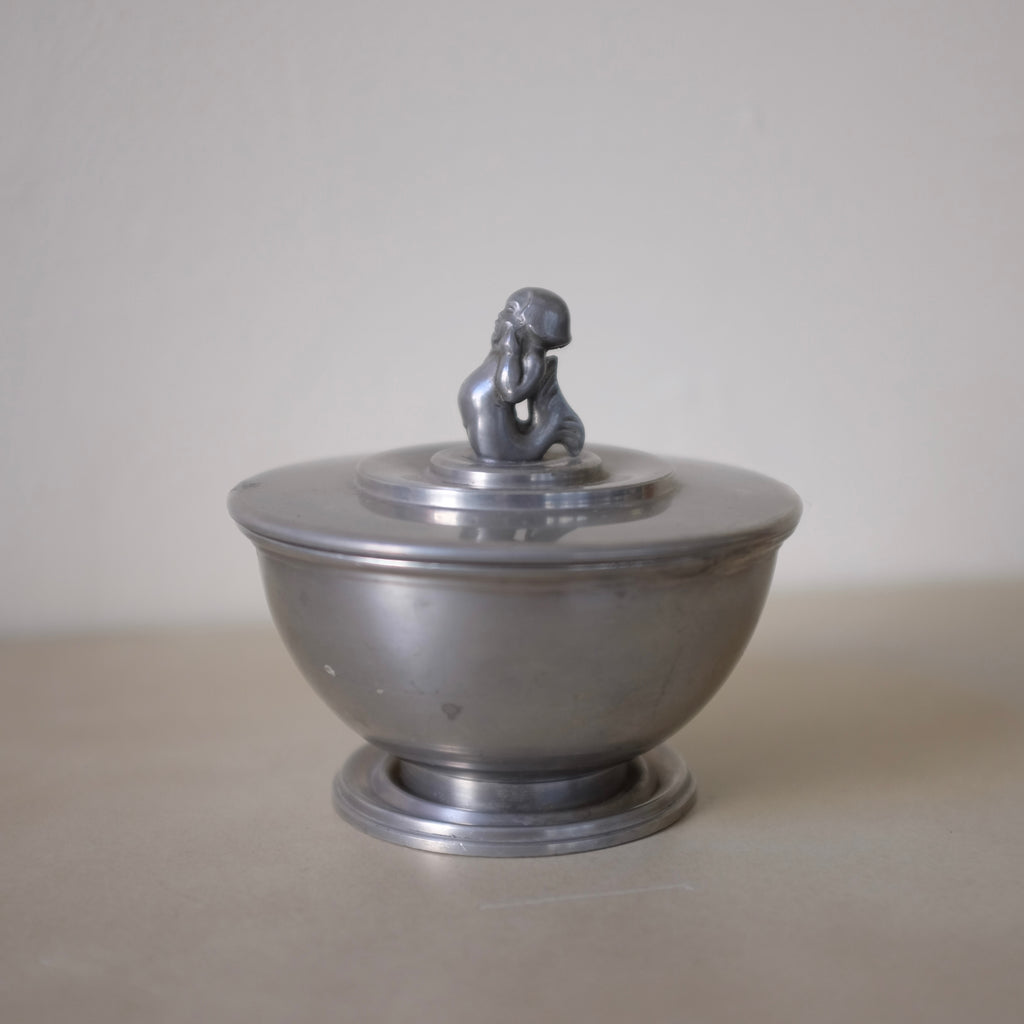 Lovely Swedish Pewter Bowl from 1931. Round shape with a decorative figurine on the top of the lid. Engraved on the outside with a anniversary message from 1934 and also the inside shows an handwritten anniversary greeting message. Age appropriate wear to the pewter.