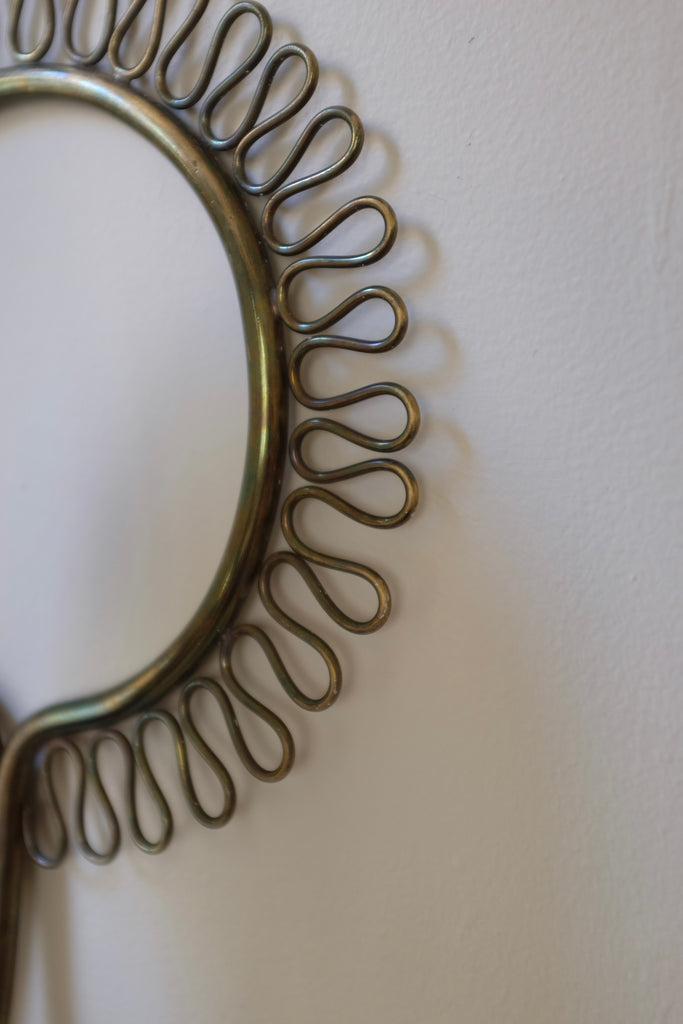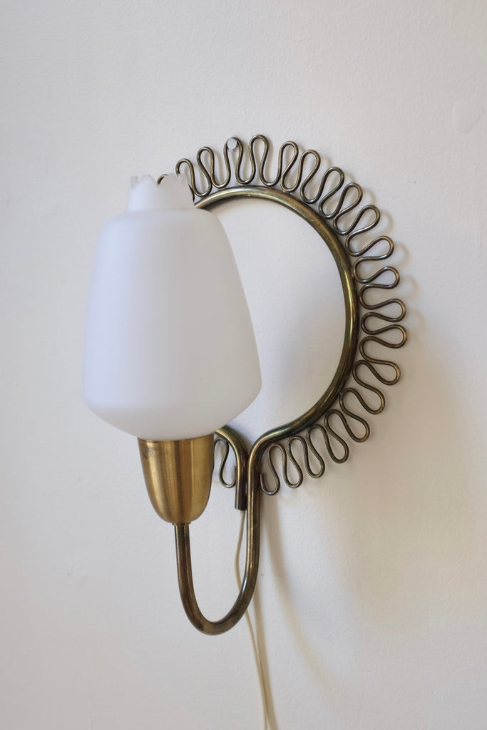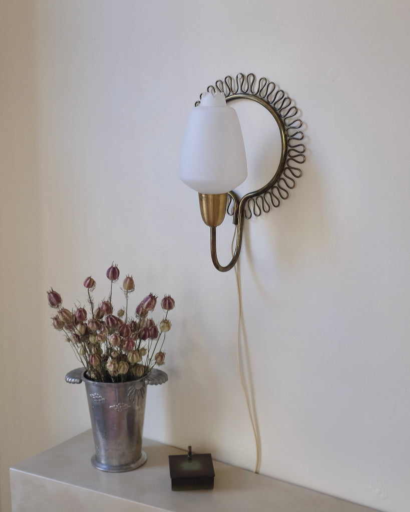 Charming Swedish 1950s Brass and Glass Wall light. Round lamp arm with a decorative brass filigree design. One light source with a frosted glass lantern. Age appropriate wear with patina to the bras and glass. Original EU wiring.