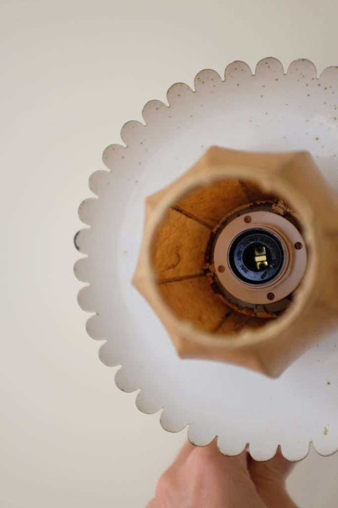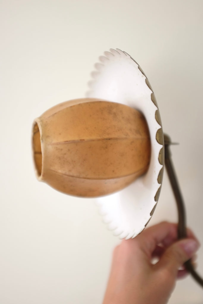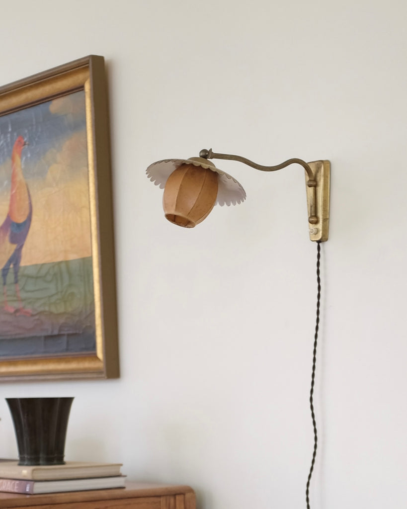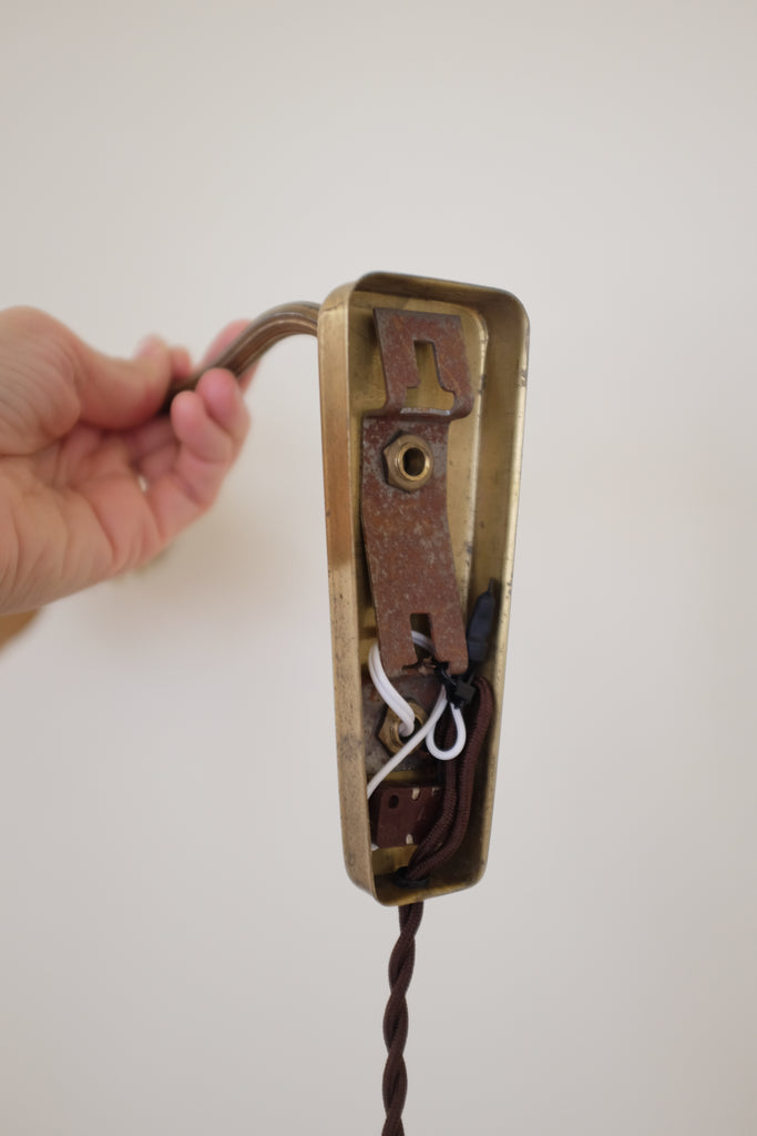 Charming Pair of 1950s Danish Wall lights attributed to Bent Karlby for Lyfa, Denmark. The lamps consist of a decorative brass lamp shade with a wavy edge and original sprayed plastic shades. The lamp arm has a soft curve and attach to the wall with a brass canopy. Comes with new US wiring. Age appropriate wear with patina to the shades and brass. A rare pair of wall lights from the Danish Modern design era.