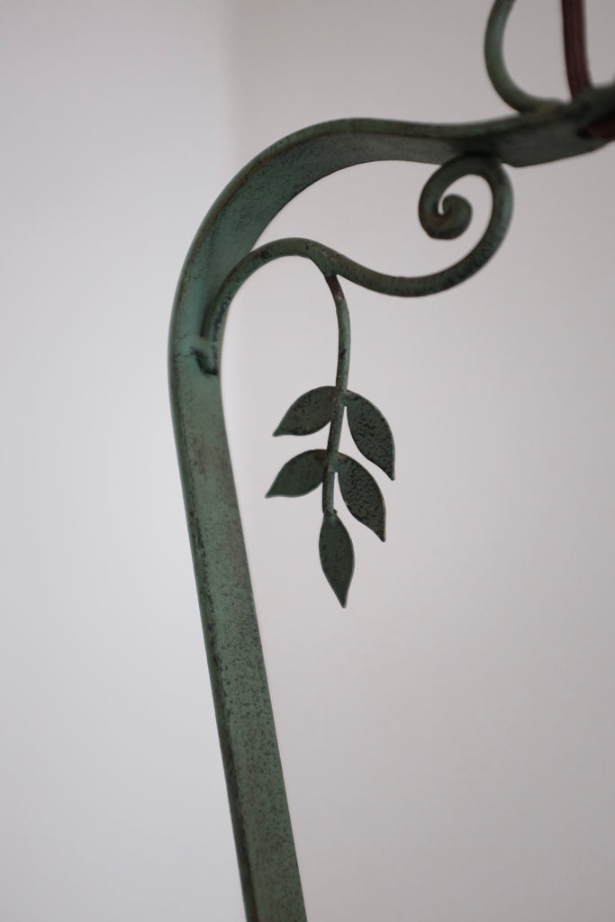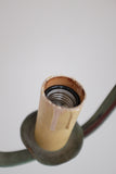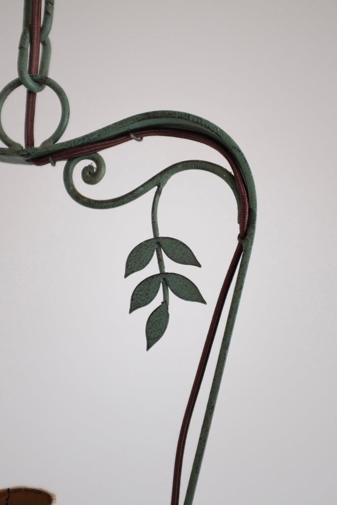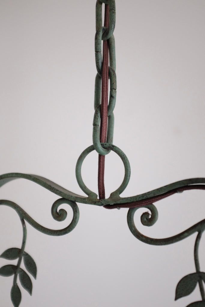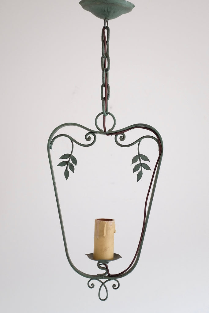 Vintage Swedish outdoor metal pendant with leaf ornament in green. One light source with its original candle imitation holder sits at the bottom of the pendant with organic and leaf shaped decoration around the pendant. Age appropriate wear with small marks and new US wiring.