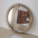 1950's Brass mirror in the manor of Josef Frank, Svenskt tenn. Beautiful filigree design around the edges. Age appropriate wear to the brass and glass och overall in a very good condition.