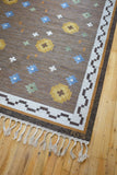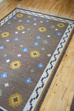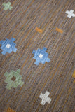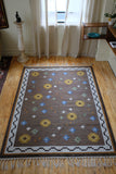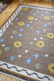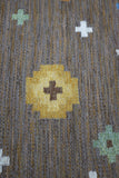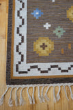 Beautiful vintage rug in a design called "Blomsteräng" by Swedish Textile designer Anna Greta Sjöqvist. A geometric pattern in blue, yellow and green sits against a brown background with a black and white border. Very good vintage condition with age appropriate wear to the fringes, some which have come undone.