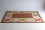 Beautiful Mid-Century rug by Swedish designer Astrid Sampe. A brown and yellow rectangular shape in the middle is surrounded of stars and organic shapes in green, yellow and pink tones. Astrid Sampe was a prolific textile designer not only in Sweden but around the globe designing rugs for the United Nations and exhibitions both in the US, UK and Germany. This rug showes the organic influence the 1940/50s Swedish Modern design movement had with its softer tones and organic influences. In a very good condition with a few fringes un-down and with a slightly darker tone in color.