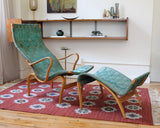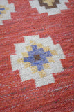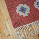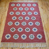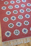 Gorgeous Geometric patterned Vintage Swedish Mid-century Rug with the designer initials of KH. Red background with with white a design depicting flowers with accent colors in beige, blue, green and brown. Very good condition with majority of fringes intact.
