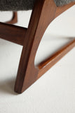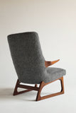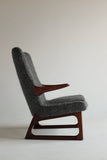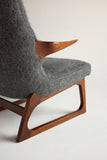 Stunning 1960's Mid-Century Easy chair by Fredrik A. Kayser for Vatne, Norway. The chair has beautiful carved teak armrests and legs that echos the Scandinavian Mid-century style at the time. Fredrik A. Kayser was a leading furniture designer in Norway and started working with Vatne Lenestolfabrik in 1958 up to the designers death in 1968. Age appropriate wear to the frame with new upholstery in grey wool and mohair fabric by Pierre Frey.