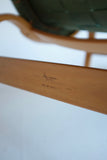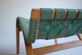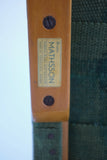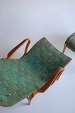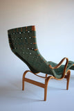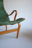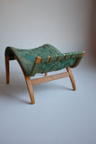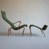 The Iconic Pernilla lounge chair and Ottoman by Bruno Mathsson for Firma Karl Mathsson. From the late 1940’s/early 1950s with the signature of the maker and designer on the chair and the Ottoman. Upholstered in a rare green webbing with age appropriate wear. This is a true iconic Swedish mid-century design piece that is as comfortable as beautiful to look at.