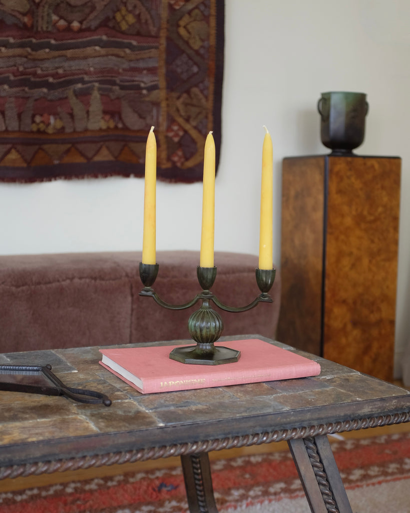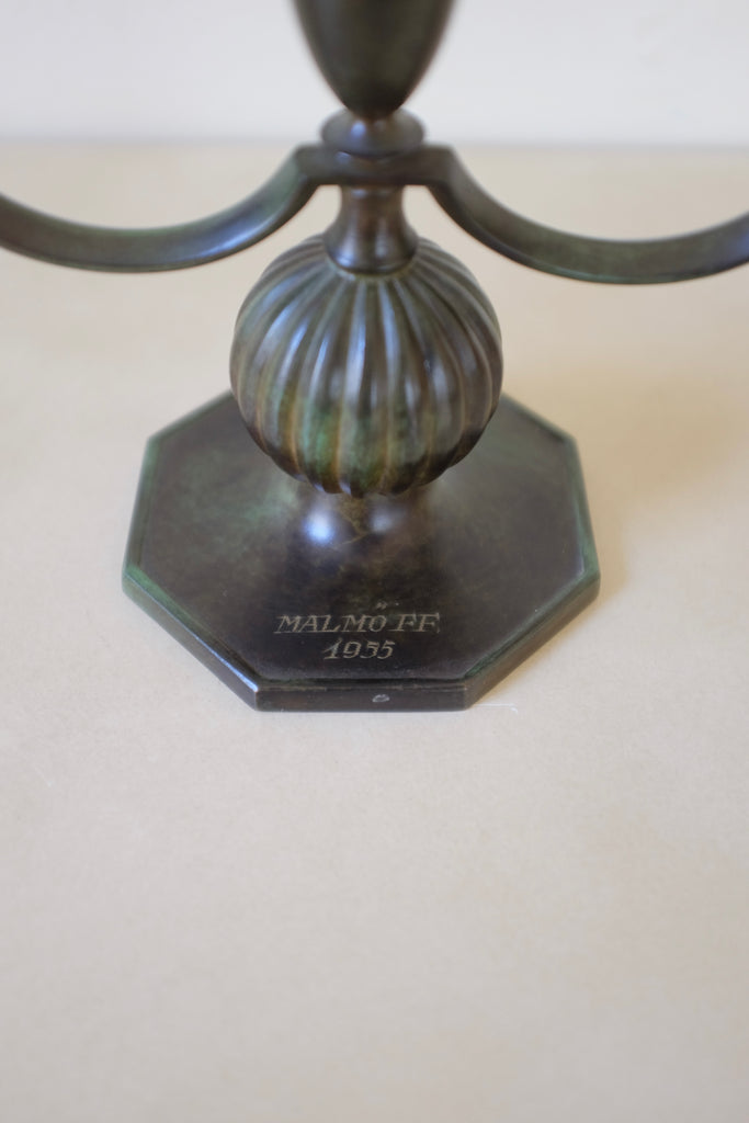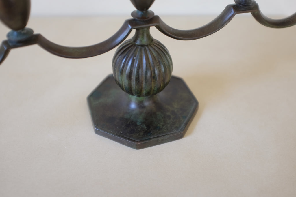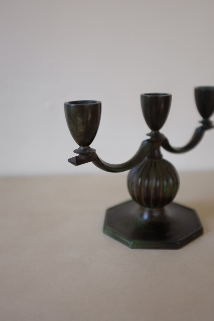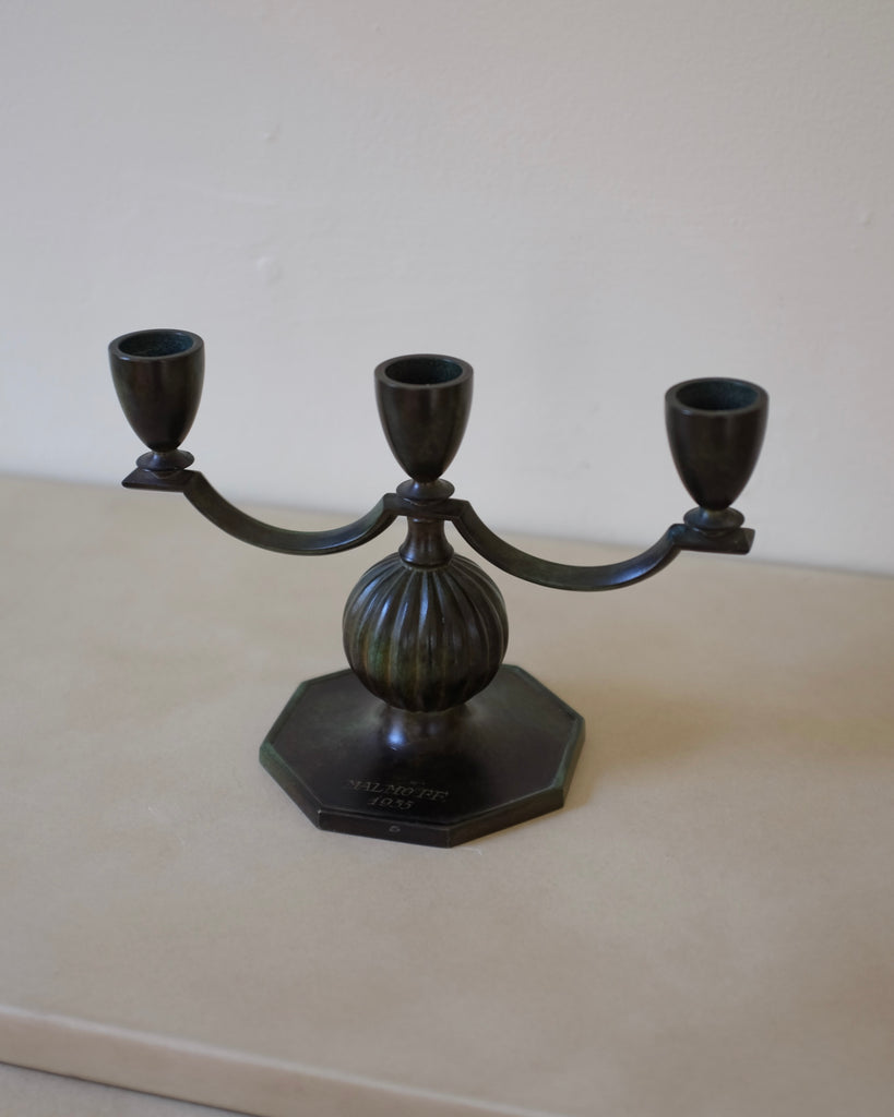 Small bronze candleholder by GAB, Sweden, with space for 3 candles. Beautiful curvy shape with a nice green shade. Age appropriate wear with some shading to the bronze and a small engraving on the foot.