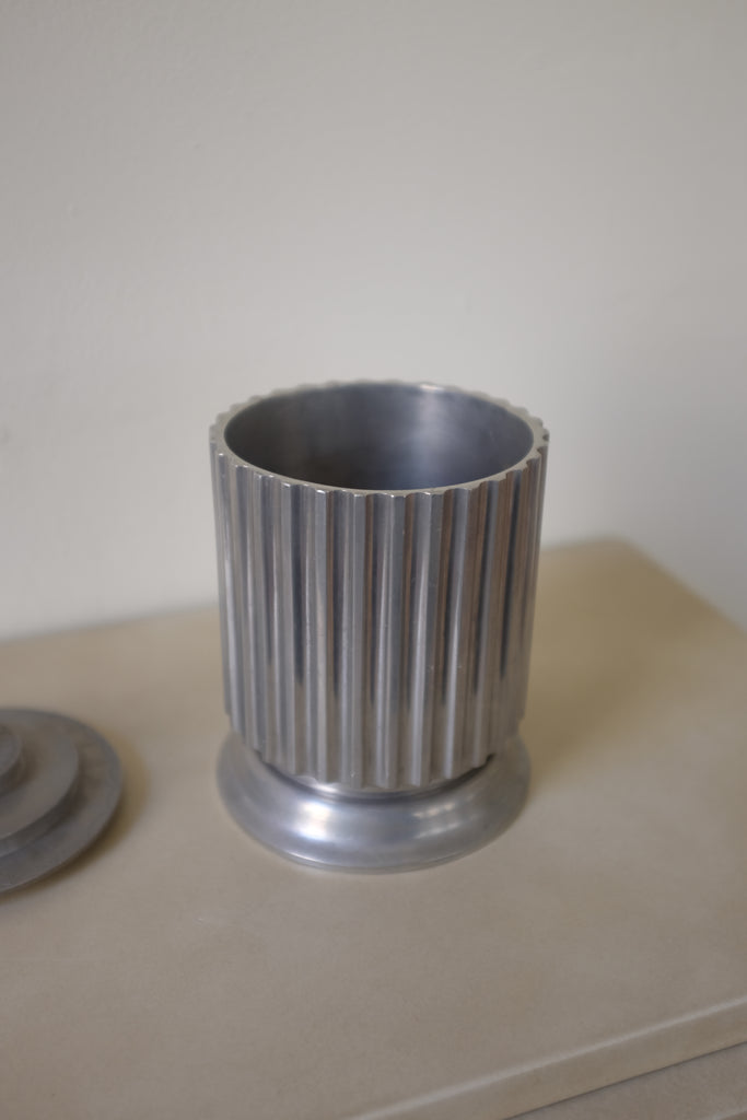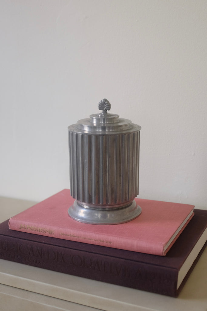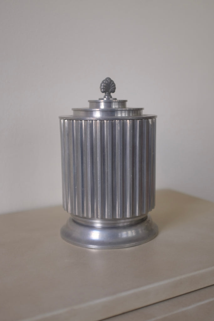 Beautiful large 1930s Pewter Jar by Astrid Aagesen, Helsingborg, Sweden. Cylinder shaped body with vertical fluting and the lid has decorative engravings around and a plume like top. Made during the 1930s when Astrid Aagesen ran her won studio in the city of Helsingborg in the south of Sweden. Age appropriate wear with some unevenness to the for. Overall a stunning piece in a neoclassic design typical for the design era in Sweden.