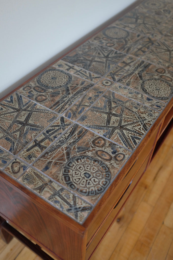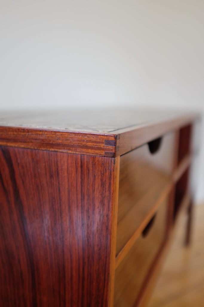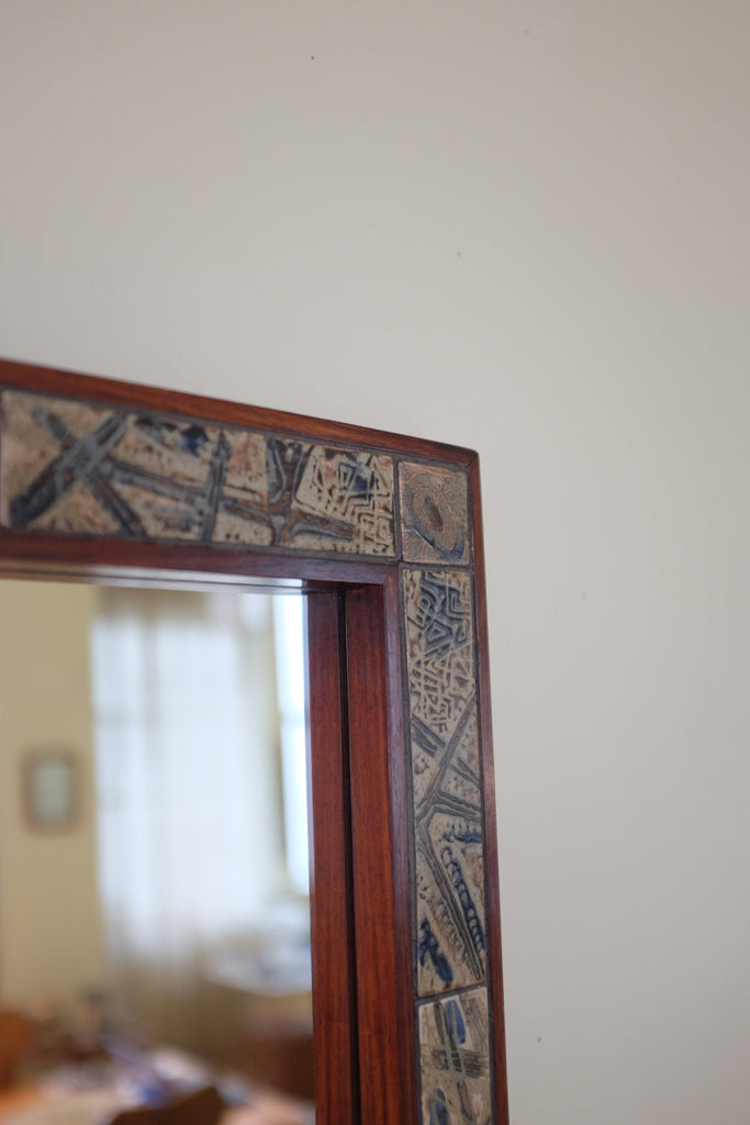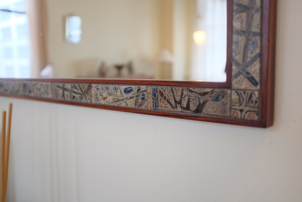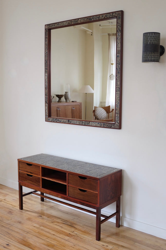 Circa 1970s Pair of Rosewood Mirror and Side Table by Severin Hansen Jr. Manufactured by Haslev Møbelfabrik, Denmark, with tiles made by Royal Copenhagen in brown, beige and blue shades. This pair really shows of the designers signum with clean lines and sharp details. Age appropriate wear with small marks to the wood and the tiles intact.