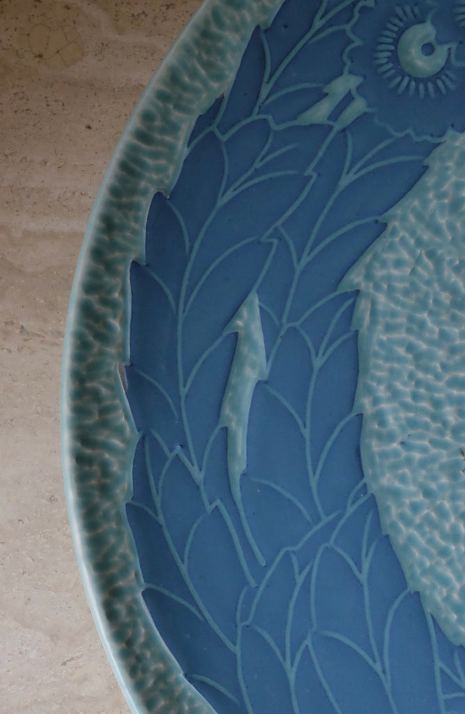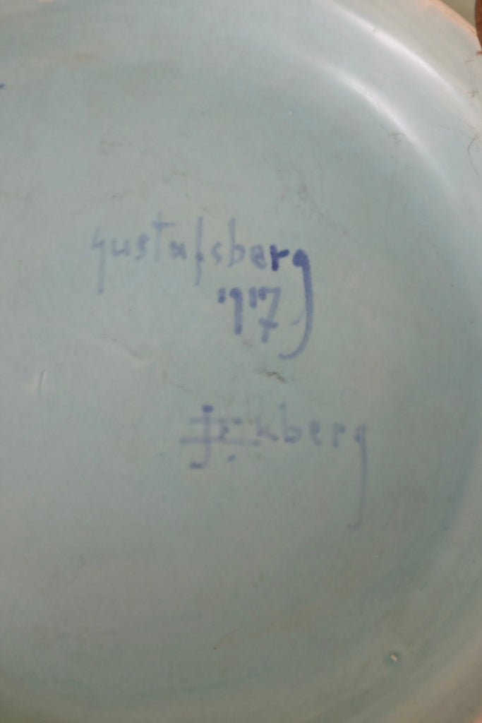 Blue Sgraffito plate from 1917 by Josef Ekberg for Gustavsberg, Sweden. Beautiful flower motif in Swedish Jugend (or Art Nouveau) style. The artist signature is visible at the bottom with the year 1917 and Gustavsbergs name. In great vintage condition with age appropriate wear with small marks.